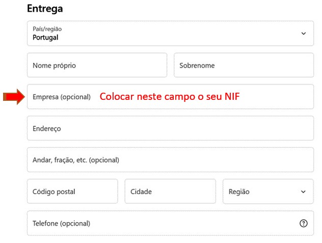 Caso pretenda qua a fatura contenha o seu número de contribuinte, no momento do checkout, no campo “EMPRESA”, por favor coloque o seu NIF.
